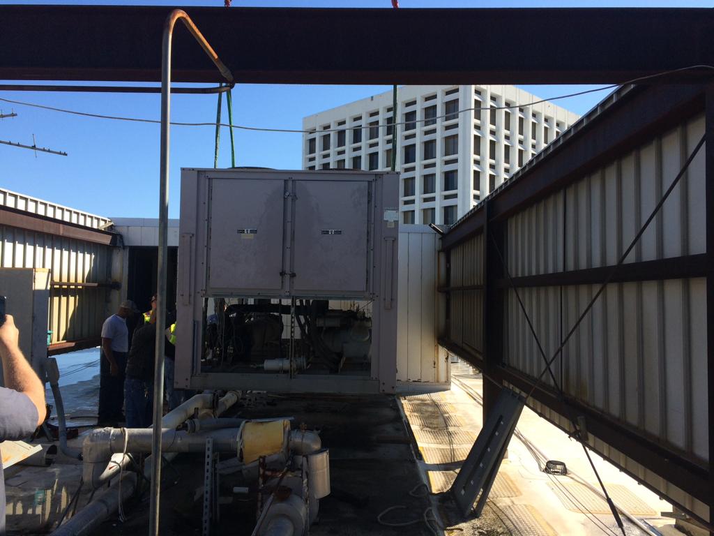 Installation of a high-efficiency commercial chiller unit, including all associated piping, controls, and electrical connections.