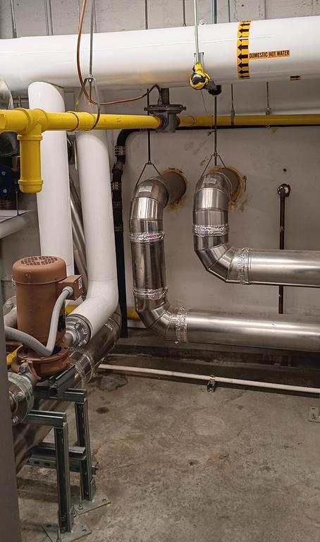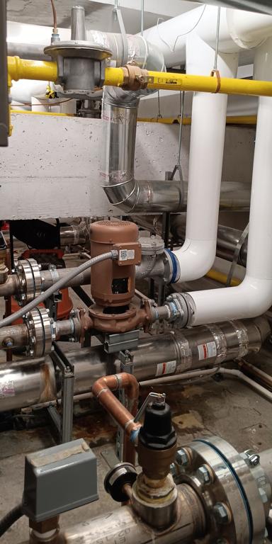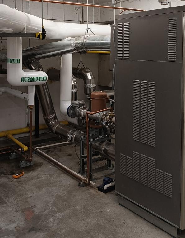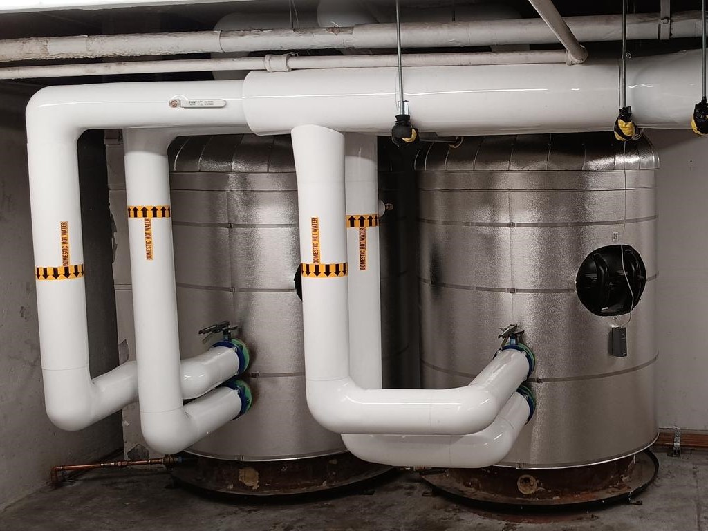 Replacement of existing boilers with new high-efficiency units and domestic hot water storage tanks, including all new piping, valves, expansion tanks, gas lines, and electrical connections.